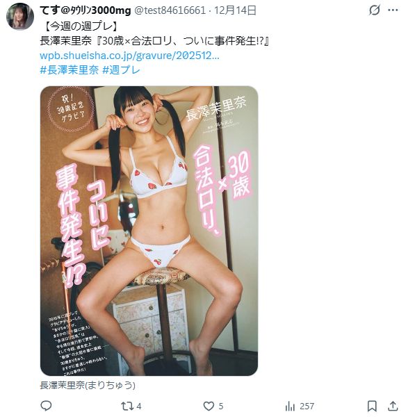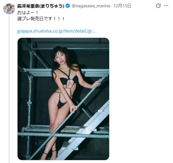グラビアアイドルの長澤茉里奈(30)が、15日発売の『週刊プレイボーイ』52号(集英社)のグラビアに登場する。