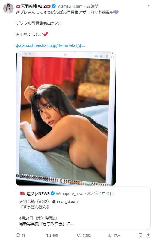 アイドルグループ「#2i2(ニーニ)」の天羽希純(あまう・きすみ)さんのデジタル写真集「【デジタル限定】天羽希純写真集『もっと見せたいー続・きすみすきー』」(集英社)が発売された。