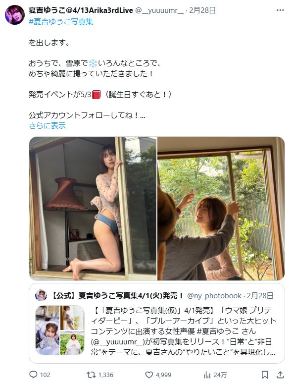 — 【公式】夏吉ゆうこ写真集4/1(火)発売! (@ny_photobook) March 9, 2025