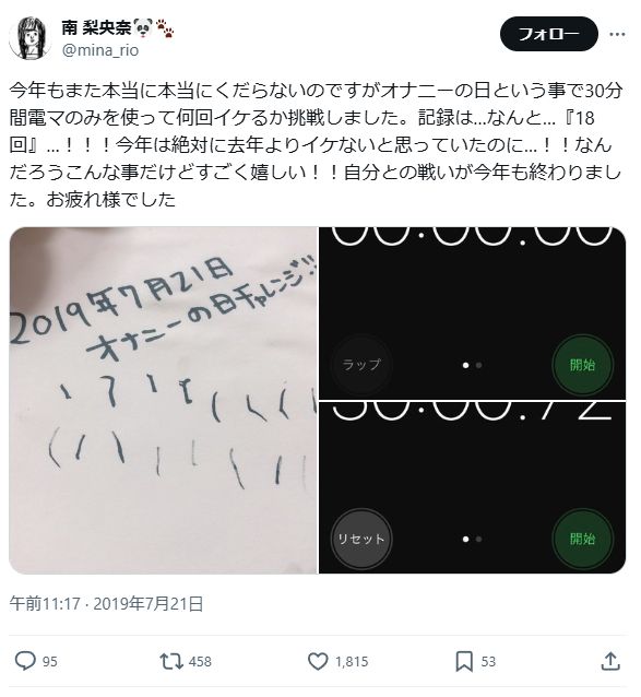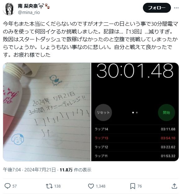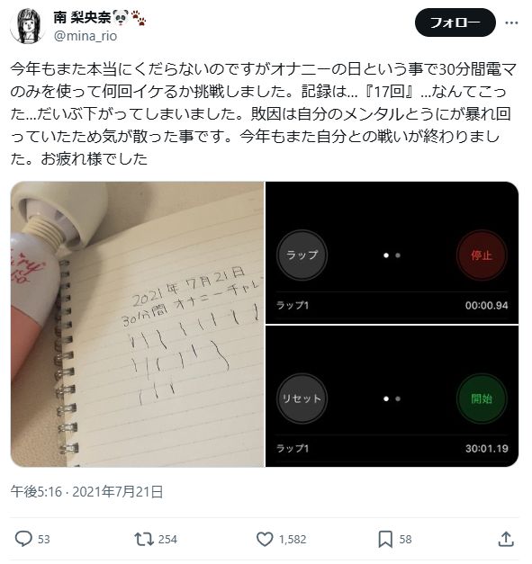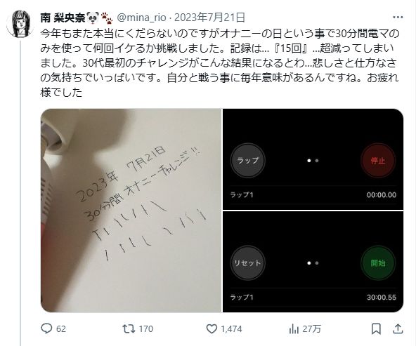 オナニーの日ということでわかりやすいよう30分間で電マでどれだけイケるか挑戦した結果…記録は12回。去年との比較が難しいので新記録とは言えませんがとても疲れたし汗だくになりました。負けられない戦いが今、終了したのです…。はぁ〜賢者モードですよまったく!!!